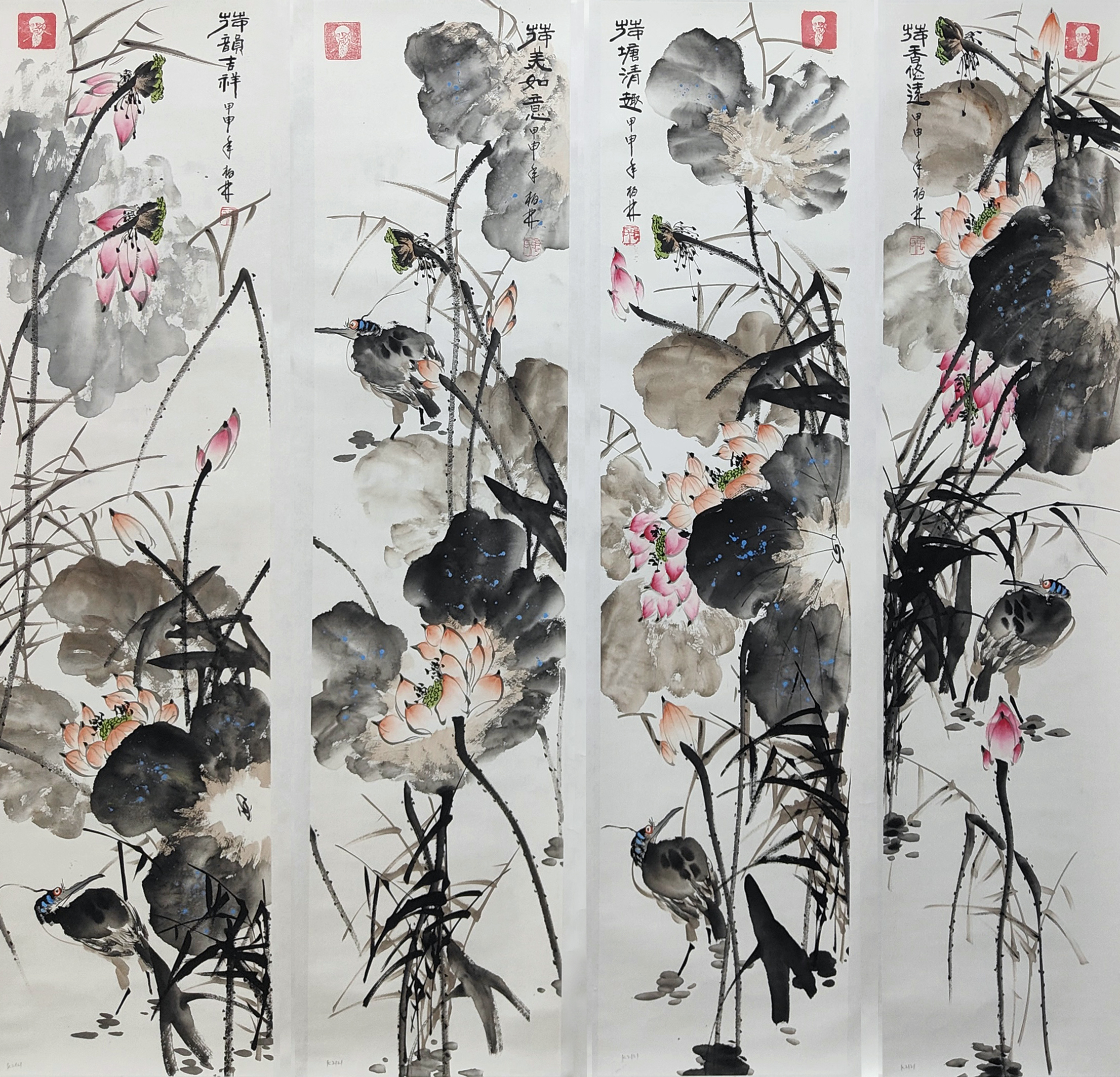 国画:荷花四条屏
