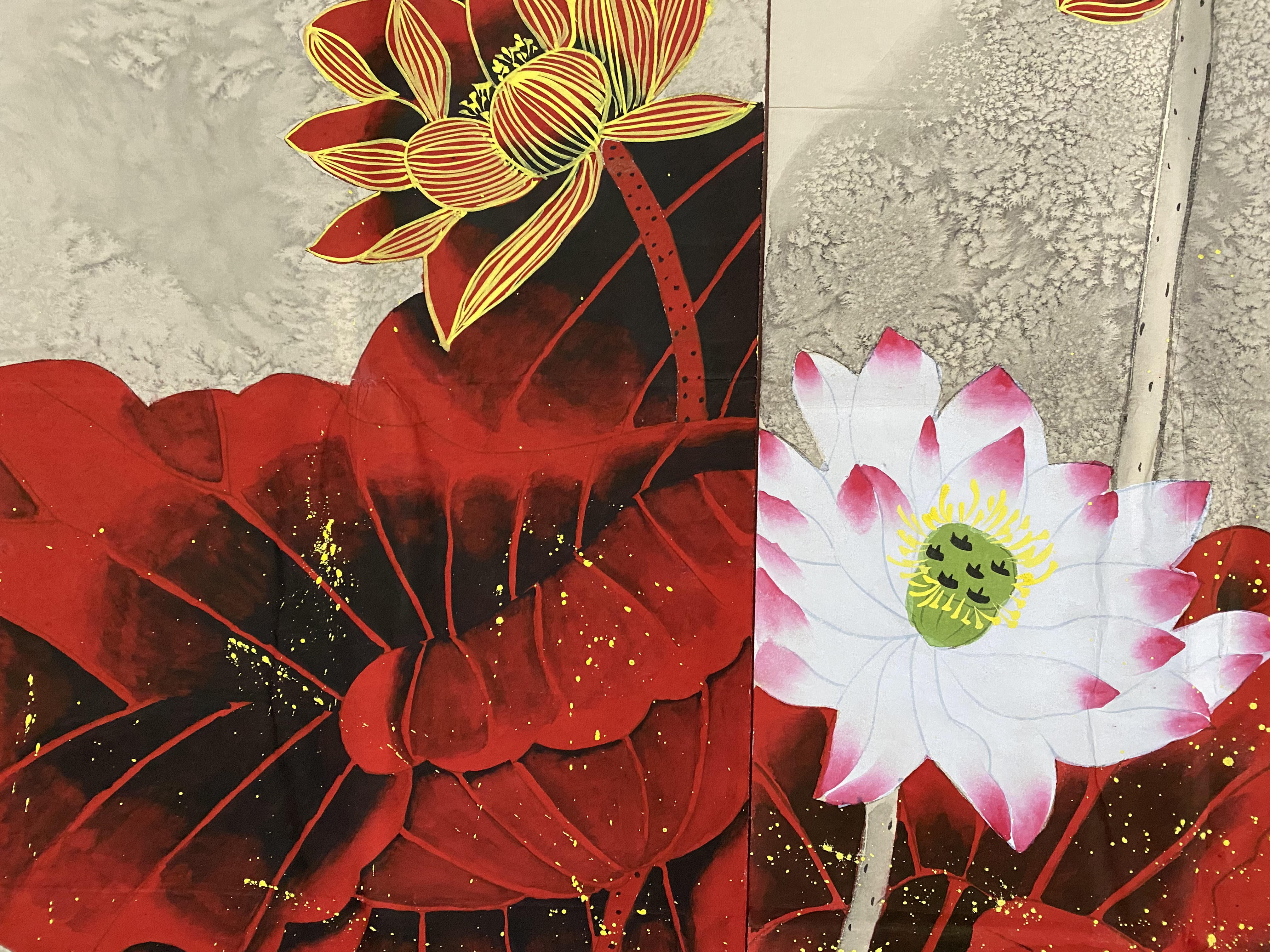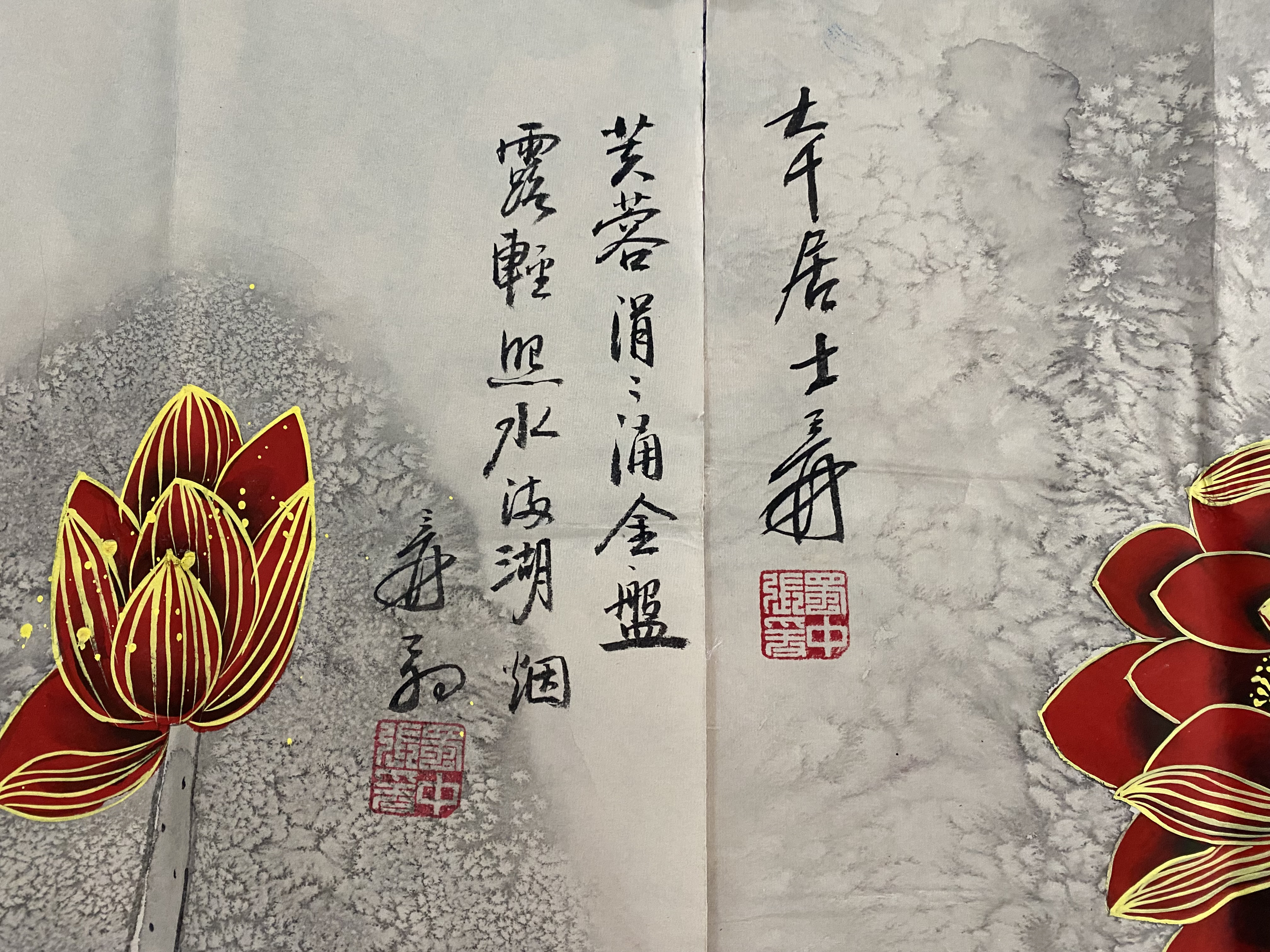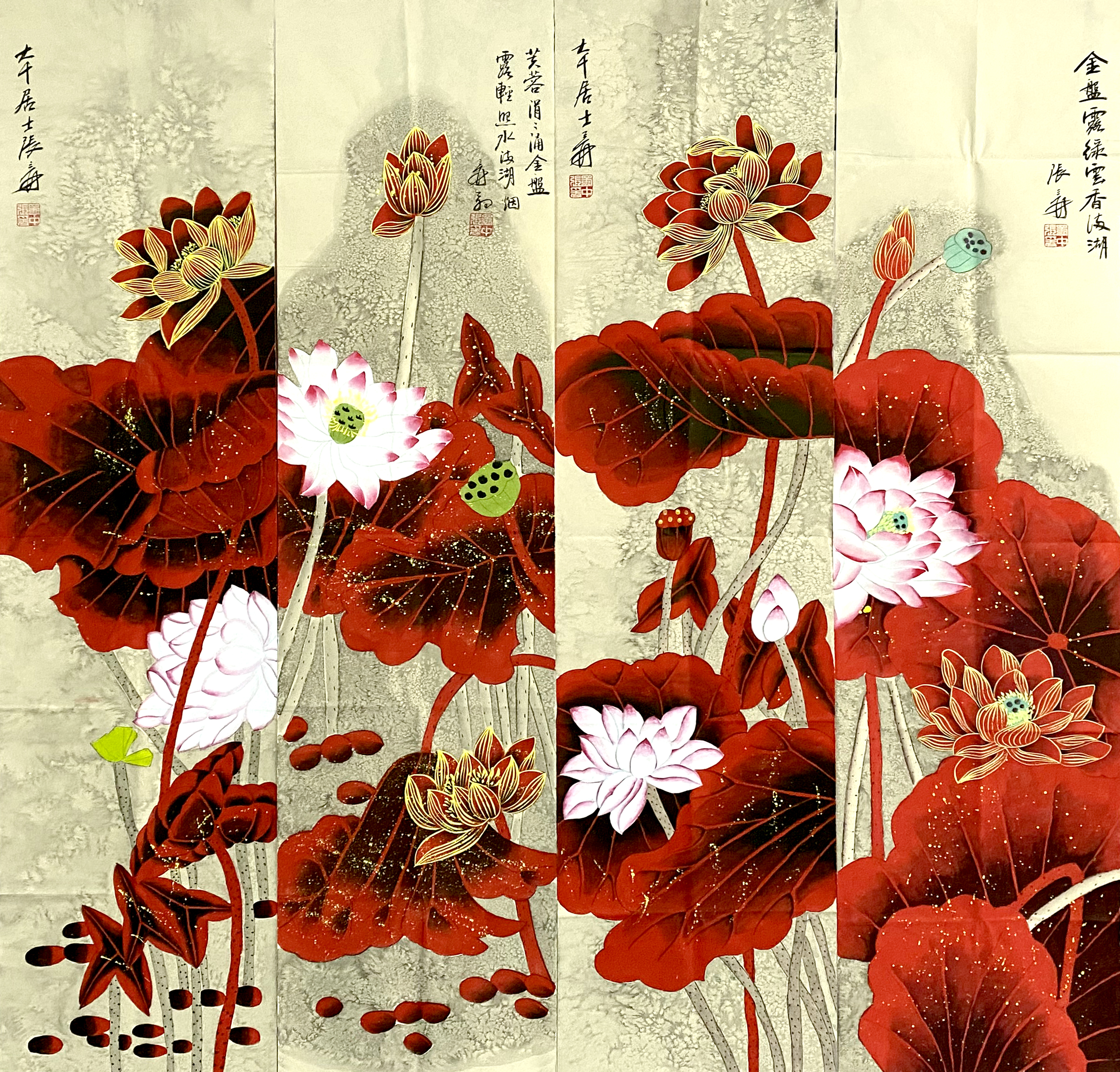 国画:红荷四条屏