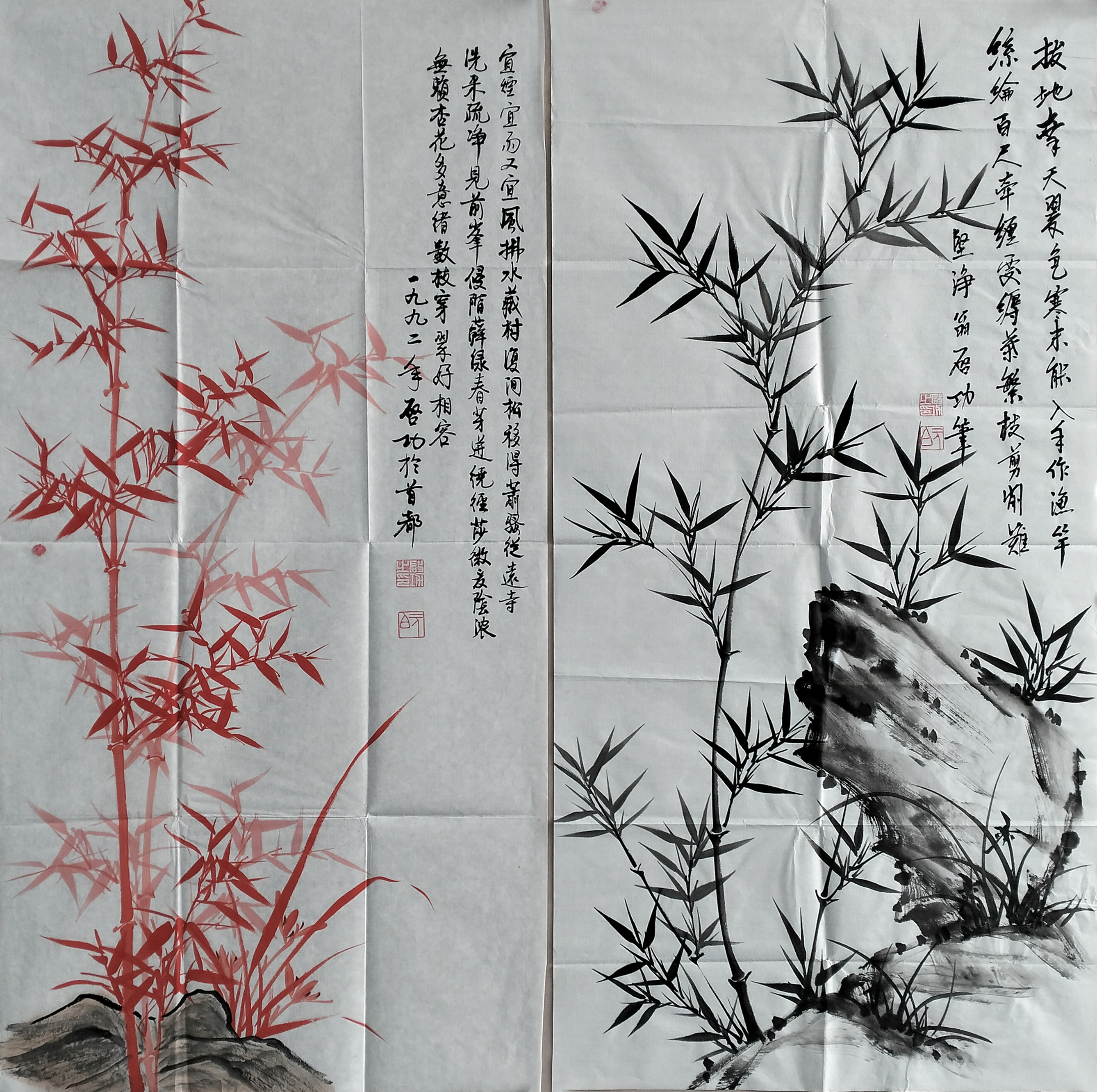国画:墨竹、红竹