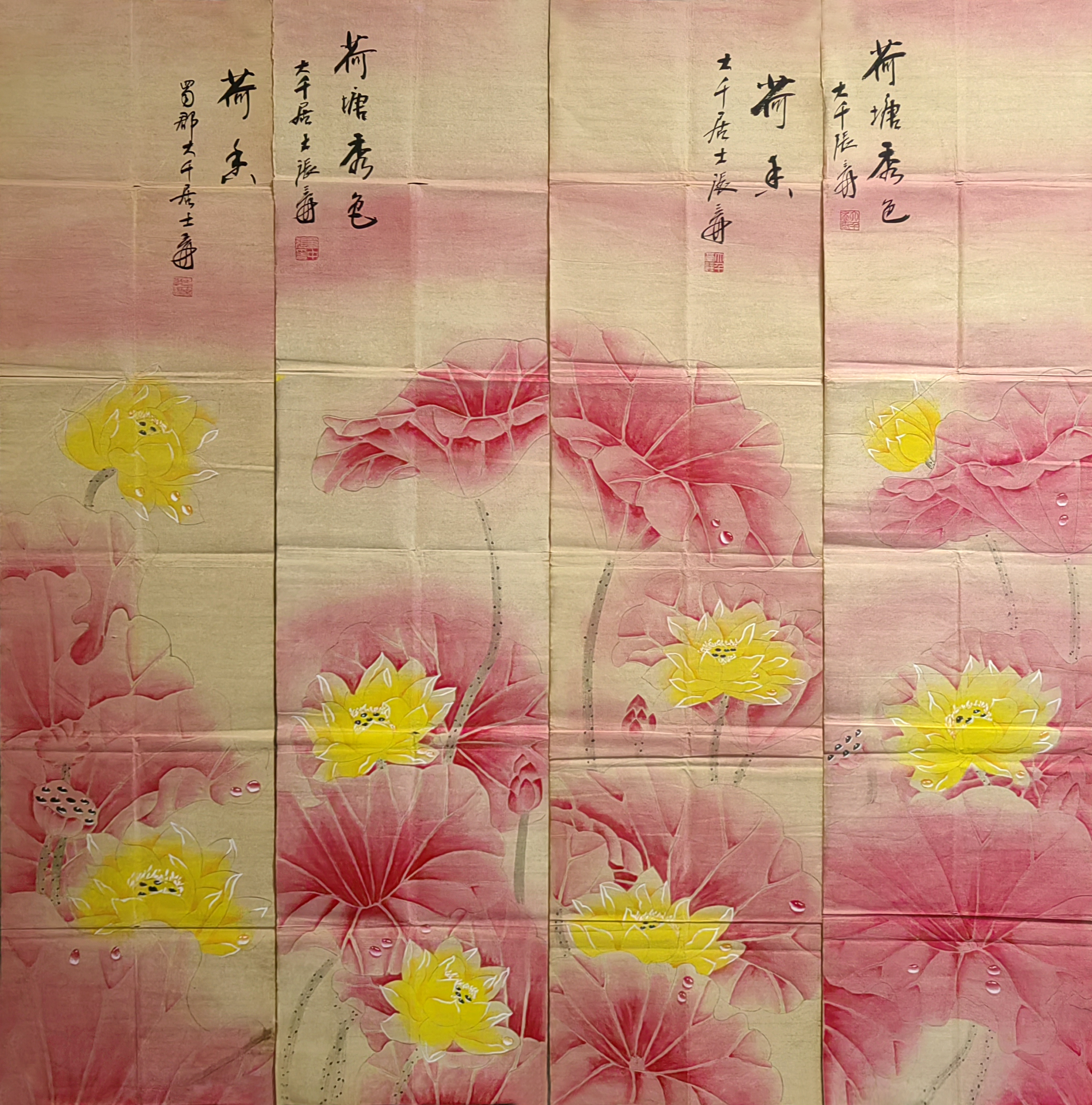 国画:荷花四条屏