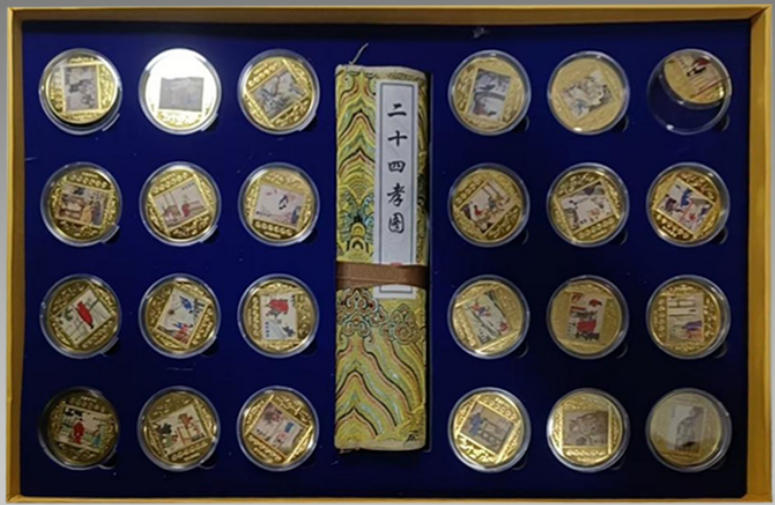 这套藏品以二十四孝为魂,金章映古贤孝行,锦卷绘传世德风。每一枚皆凝匠心,每一幅皆传孝意,是集文化、工艺与美德于一体的珍藏雅品.