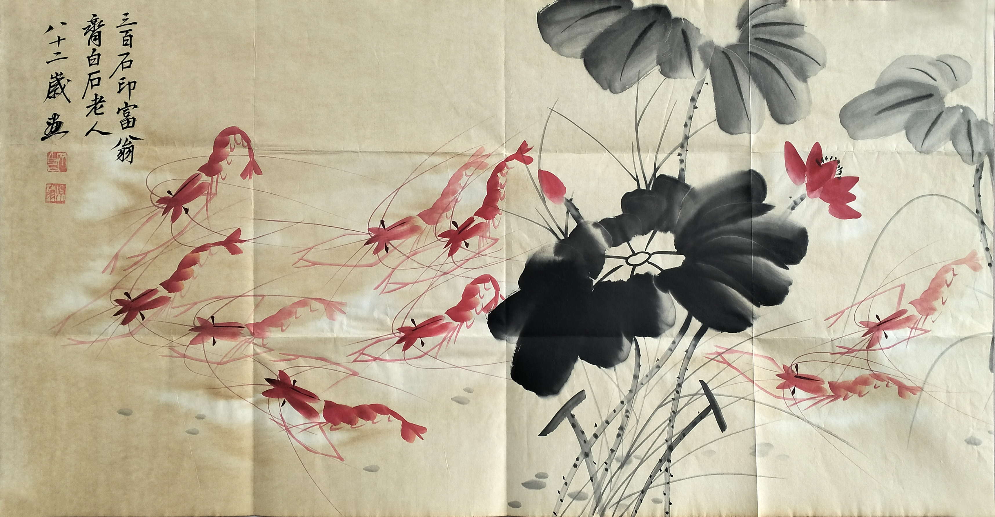 国画:墨荷红虾图