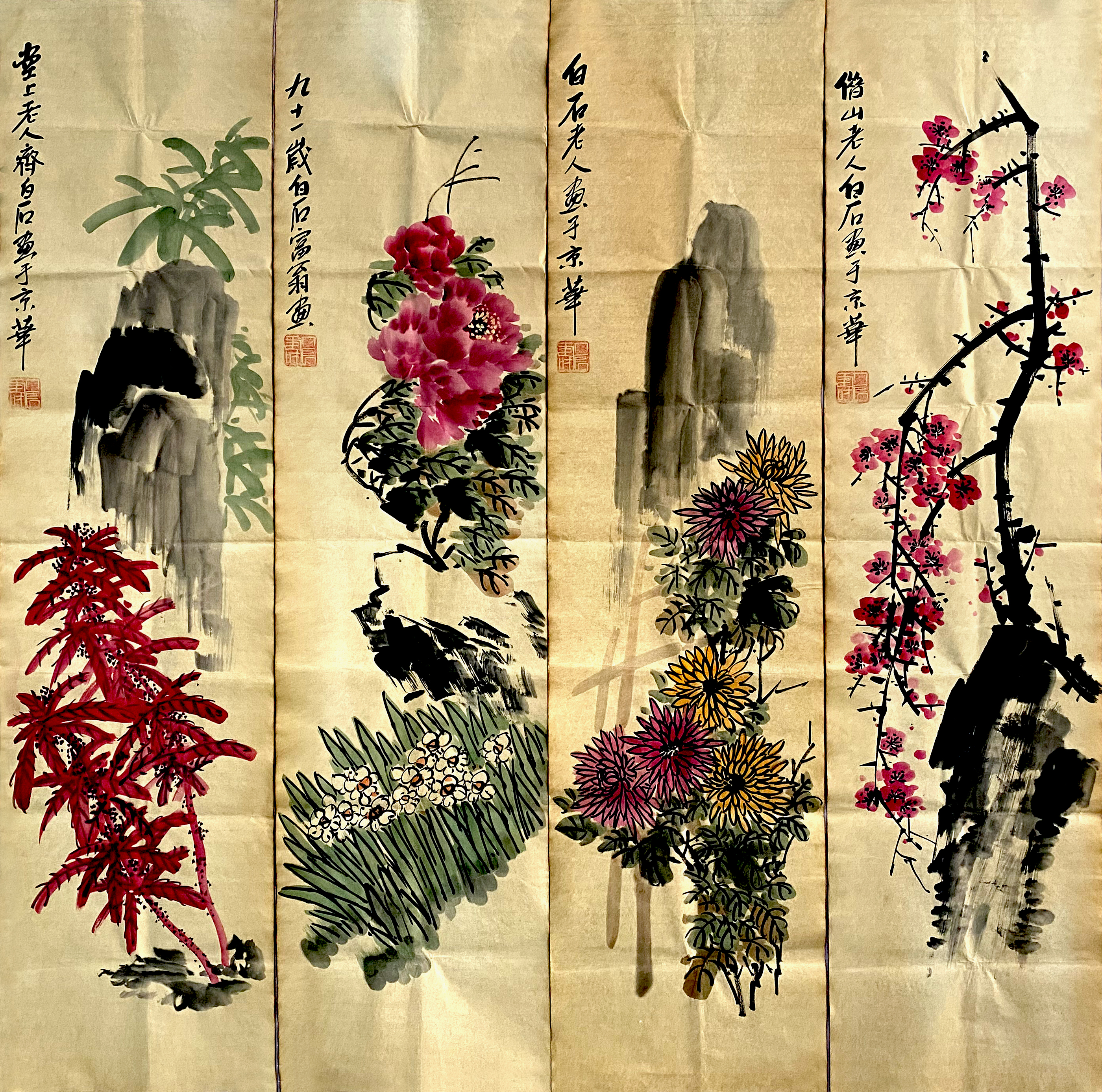 国画:花卉四条屏