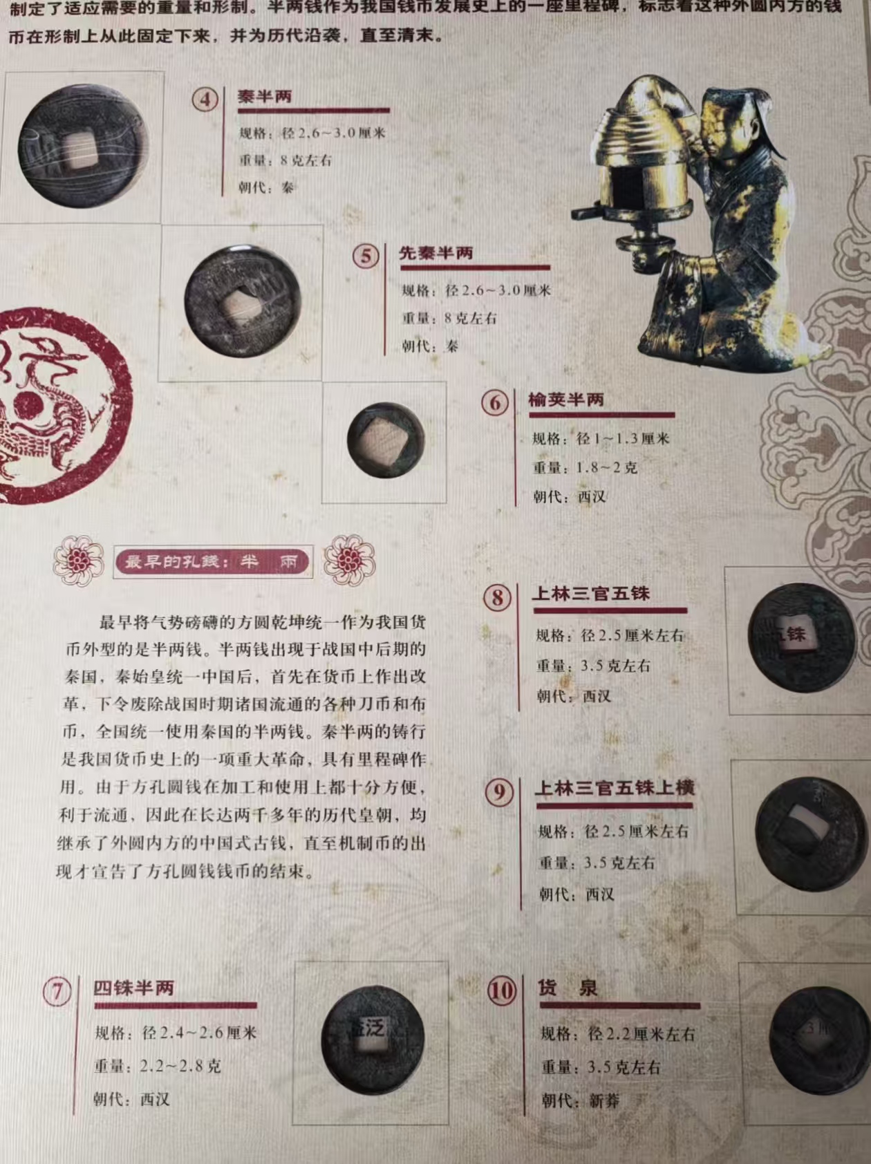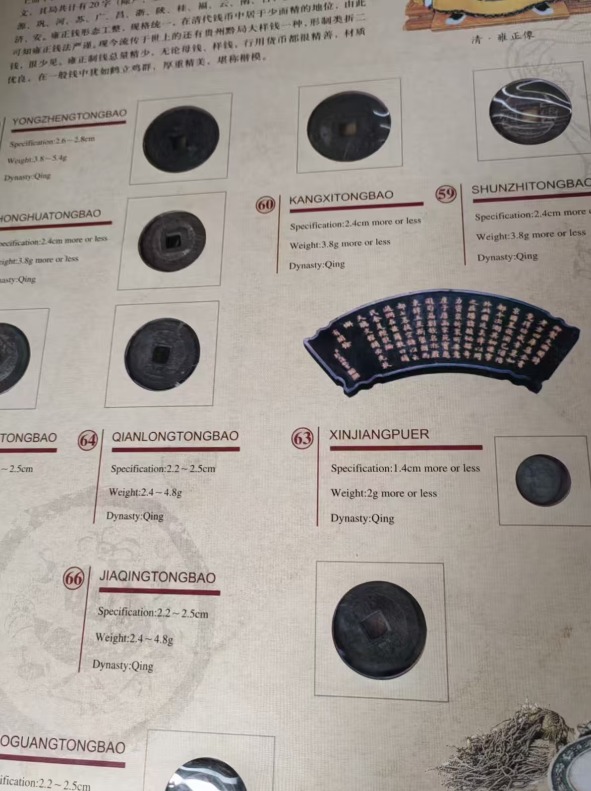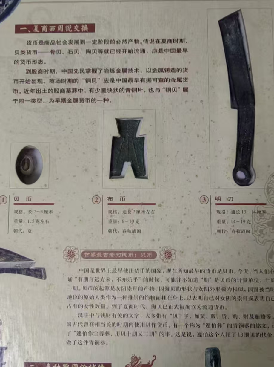 古钱币说明:该套藏品是北京润古斋文物鉴定中心于2005年限量(500套)发行的,共分为三册:第一册是夏商周的贝币、布币和刀币等22枚;第二册是从秦朝到明朝时期的钱币30枚;第三册是清代钱币42枚。每枚钱币都附有文字说明,是一件十分宝贵的收藏品。