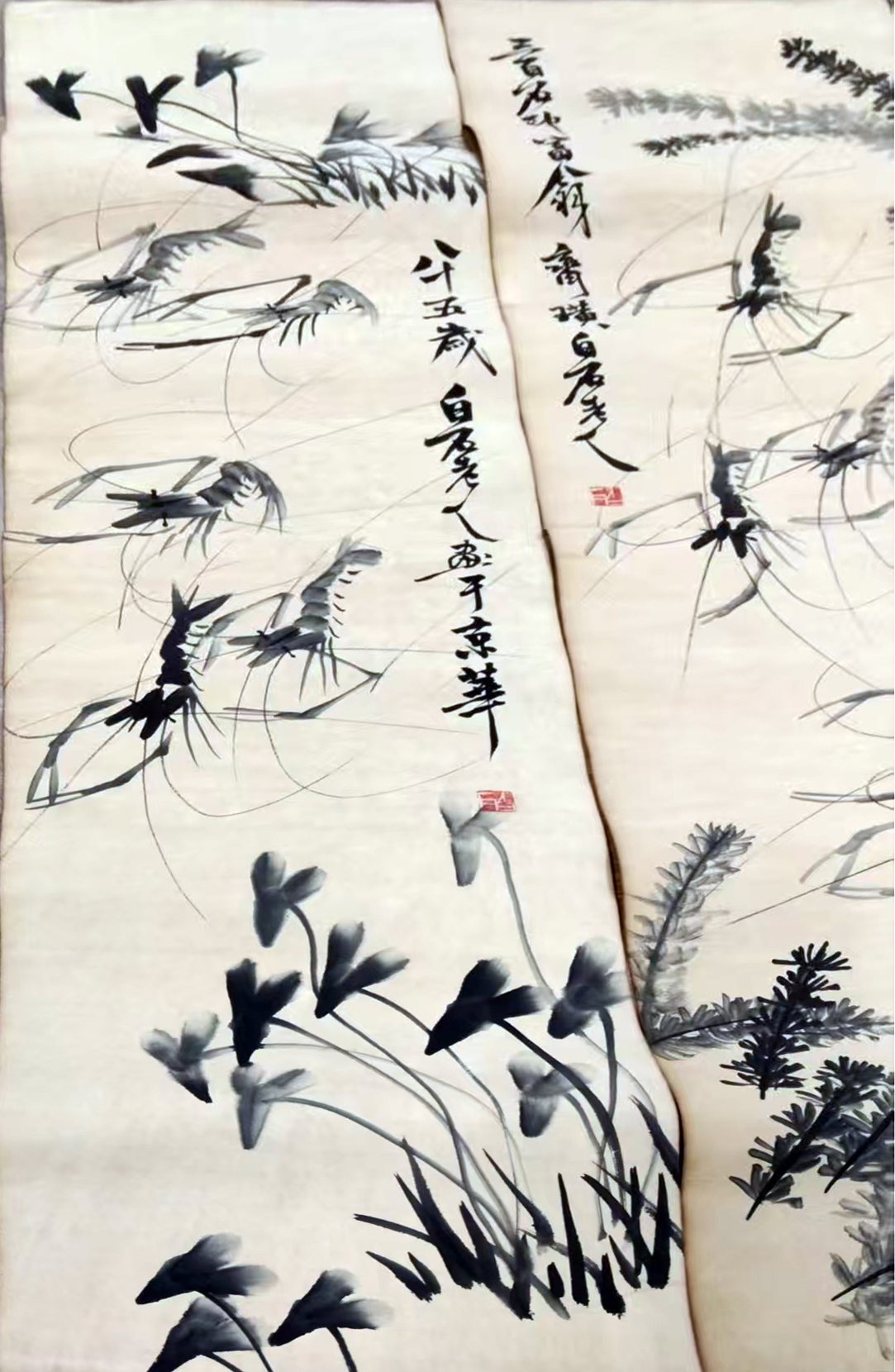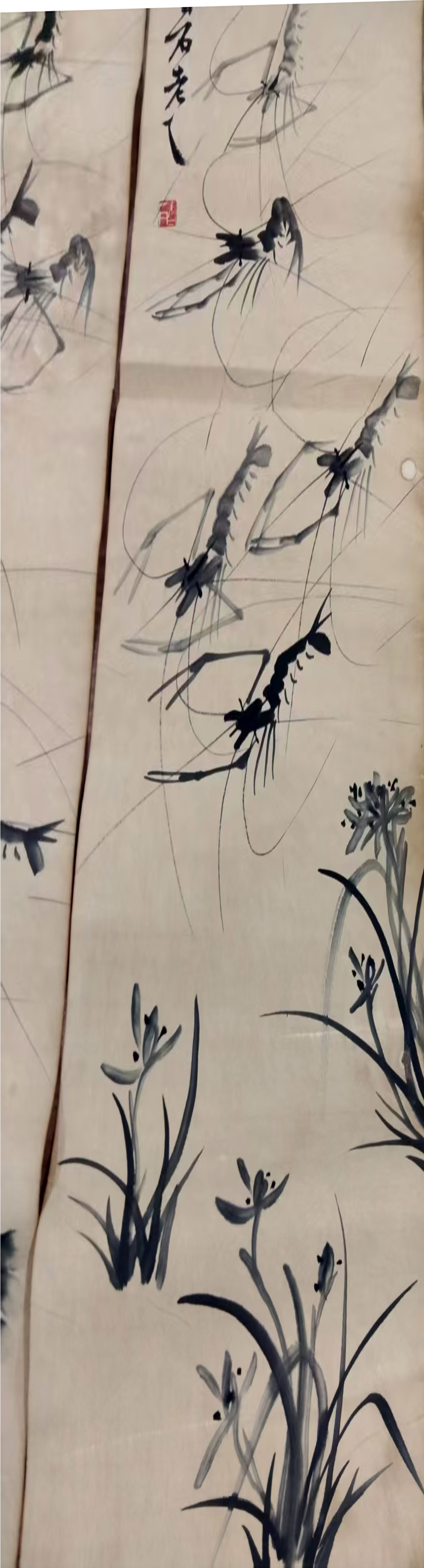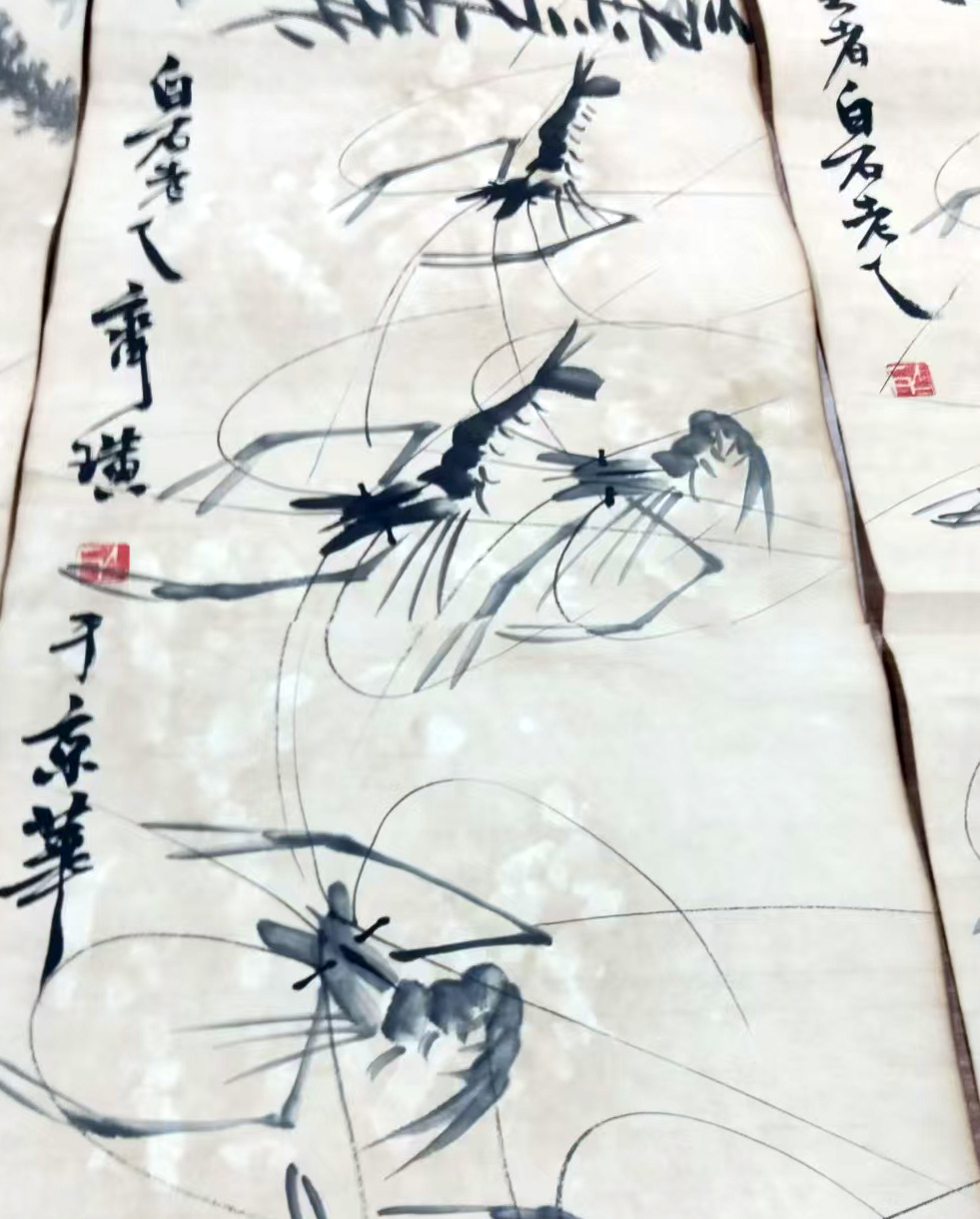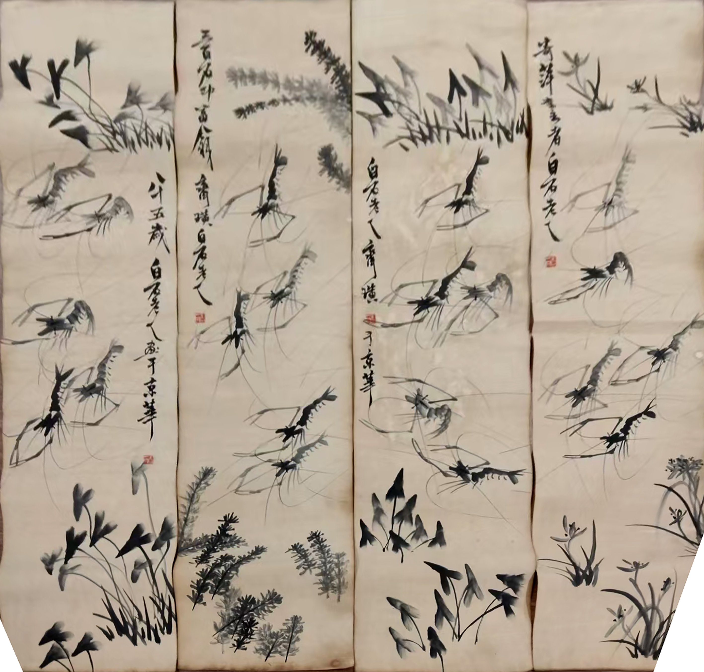 作品:虾草栖戏图四条屏